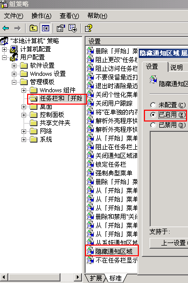 开始---点右键---属性---任务拦---自定义---选想隐藏的程序---总是隐藏!