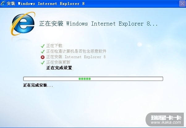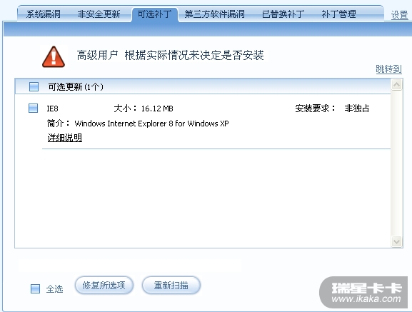再打开卡卡打完全部补丁,在可选补丁上选了IE8升级,按提示重启后还是IE6