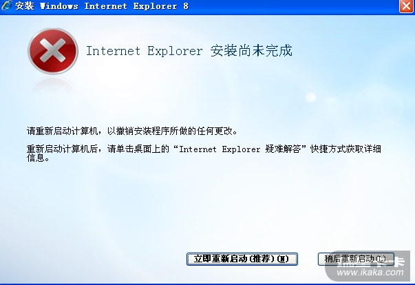 今天重装了一个安装版的系统,用以前下的IE7去升级完成后提示重启计算机,结果重启完后还是IE6