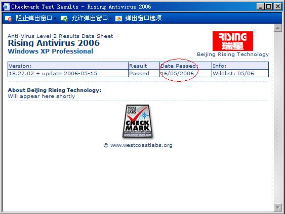 Rising公司荣获由英国西海岸实验室(West Coast Labs)授予的 Checkmark 认证,该实验室是全球著名的独立科研中心。Rising产品经过严格测试,证明能够 100﹪ 查杀流行病毒和恶意程序。成为国内首家连获三项Checkmark认证的反病毒公司。