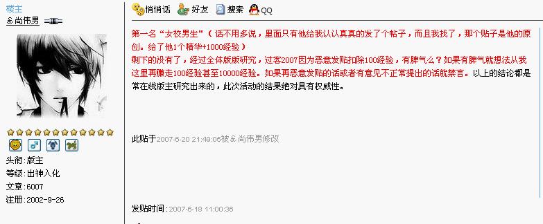 【回复“过客2007”的帖子】你要认清,第一,你没有得罪我.第二,扣你的分是经过集体研究的.我不是说了么,有想法就去我那里发精华的帖子,想法从我那里赚走100甚至1000经验,做个男人要有点理想,我不会针对任何人的,只是就事论事,不管谁发那种帖子,我都会扣分的.私下跟你说,以前我当嘉宾得时候有人在我得名字后面+了一个.  晚上就用那个在我名字+.的号在瑞星恶意灌水,当时是03年5月左右,非 典的时候,我一直劝他,劝了1晚上,第二天早上5点半睡得,等到我再上瑞星的时候被降为黑户了,我什么话都没有说,不到一会衣人就把我放出来了,头衔也降到会员了,后来经过我的努力吧,又干到了版主。跟你说这些只是想告诉你,该变聪明点了,认清形势。
