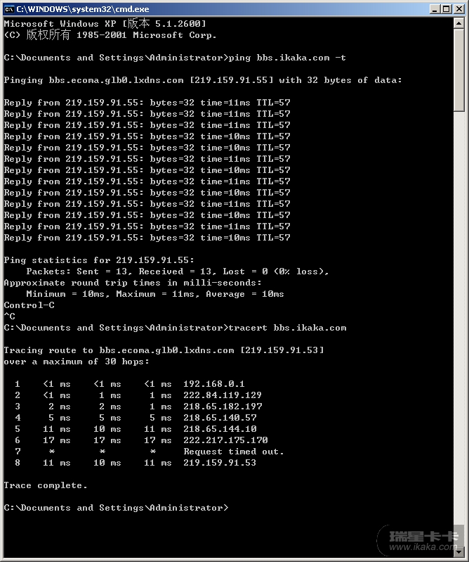 Ping bbs.ikaka.com的运行结果(开始—运行—输入cmd回车,输入Ping bbs.ikaka.com回车,运行完毕后截图保存)