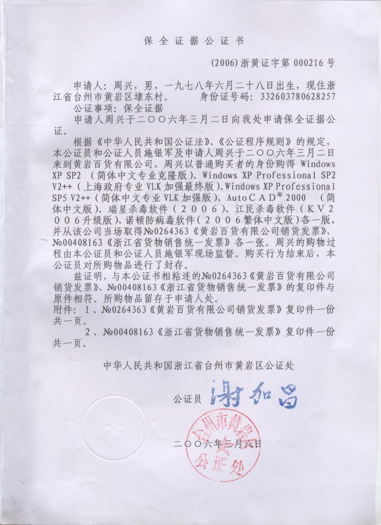 本人于2006年3月2日发现黄岩百货有限公司在销售贵司出版的瑞星杀毒软件系盗版软件,基于对正版的支付,并保护知识产权,本人在公证人员的监督之下向该公司购得了上述产品并取得相关发票及公证文书。