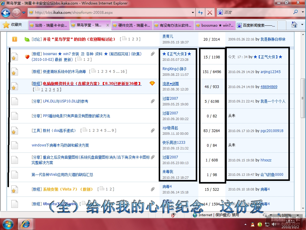 但我不敢预言“阅读量”会停滞,理由只有一个:各大搜索引擎均可搜索到卡卡论坛的帖子!只要标题名设置得好就可以了!【其实说真的,我也就是看中这一点才在这发了win7资料一帖的!】本帖深意,请版主们 自己斟酌……作为瑞星产品的“恒支持者”,我真的希望能有所改变!