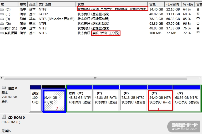 因为原来C盘小(蓝色框),就选择了 安装WIN7时.选择现在的C盘(下面红色框)