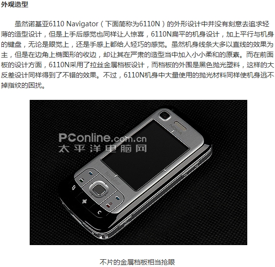 诺基亚手机造型有着直板设计的传统,也为用户带来了不少的经典机型。但是面对多变的用户需要,其有没有停止不前,并不断地推出不同造型设计的手机以满足用户。继先前推出的超薄翻盖的N76之后,今天又为我们带来了滑盖造型的新机6110 Navigator。与诺基亚主打的N系列不同,6110 Navigator只属于比较传统的6系列商务手机,但是其型号后面的Navigator字样却为其带来了不一样的意义,它代表着诺基亚在新的手机领域的“探路石”。