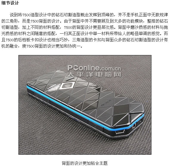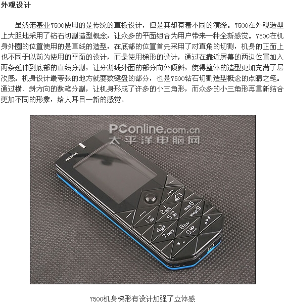 ·独特直板设计:突破了诺基亚传统的直板设计,采用一种独特的钻石切割风格设计