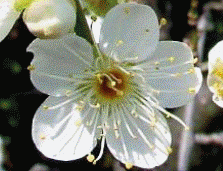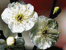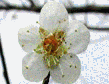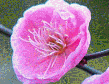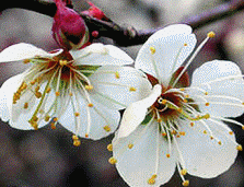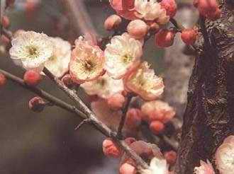 形态特征:落叶小乔木,高达lO米,常具枝刺,树冠呈不正圆头形。干褐紫色,多纵驳纹,小枝呈绿色或以绿为底色,无毛。花多每节l一2朵,多无梗或具短梗,谈粉红或白色,径2-3厘米,有芳香,多在早春先叶而开,花瓣5枚,常近圆形;弯片5枚,多呈绎紫色;雄蕊多数,离生,于房密被柔毛,罕为2-5(离心皮)或缺如,于房上位,花柱长。核果近球形,径约2-3厘米,黄色或绿黄色,密被短柔毛,味酸;核面具小凹点,与果肉粘着,4-6月果熟。株高约10m,干呈褐紫色,多纵驳纹。小枝呈绿色。叶片广卵形至卵形,边缘具细锯齿。花每节1~2朵,无梗或具短梗,原种呈淡粉红或白色,栽培品种则有紫、红、彩斑至淡黄等花色,于早春先叶而开。 梅花可分为真梅系、杏梅系、樱李梅系等。