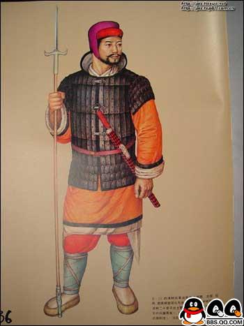10、隋代使用最普遍的铠甲为两裆垲和明光垲。两裆垲的结构比前代有所进步,形制也有一些小的变化。一般身甲全鱼鳞等形状的小甲片编制,长度已延伸至腹部,取代了原来的皮革甲裙。身甲的下摆为弯月形、荷叶形甲片,用以保护小腹。这些改进大大增强了腰部以下的防御。明光垲的形制基本上与南北朝时期相同,只是腿裙变得更长。隋代戎服为圆领长袍。本图为隋代武士复原图。左为戎服,右为胄甲。