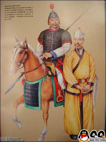 08、魏晋时期军戎服饰复原图。左侧为铁制筒袖铠,是一种胸背相连、短袖,用鱼鳞性甲片编缀而成,筒袖铠的外形与西汉的铁铠很相似,从头上套穿,这种筒袖铠坚硬无比。胄基本沿袭东汉的形制,胄顶高高地竖有缨饰。右侧为魏晋时期的戎服,主要是袍和裤褶服。袍长及膝下,宽袖。褶短至两胯,紧身小袖,袍、褶一般都为交直领,右衽,但也有圆领。