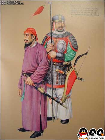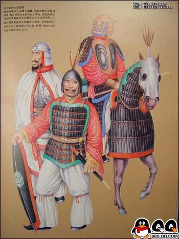09、南北朝武士复原图。图中前排为两裆铠,长至膝上,腰部以上是胸背甲有的用小甲片编缀而成,有的用整块大甲片,甲身分前后两片,肩部及两侧用带系束。图中后排两人所穿铠甲为明光铠胸前和背后的圆护有关。因为这种圆护大多以铜铁等金属制成,并且打磨的极光,颇似镜子(护心镜)。在战场上穿明光铠,由于太阳的照射,将会发出耀眼的“明光”,故名。这种铠甲的样式很多,而且繁简不一:有的只是在裲裆的基础上前后各加两块圆护,有的则装有护肩、护膝,复杂的还有数重护肩。身甲大多长至臀部,腰间用皮带系束。