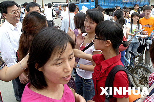 6月8日,结束高考的考生在成都第五十中学考点外与家长、老师交谈。截至当日17时,除上海、广东和江苏三省市外,2006年全国普通高等学校统一招生考试降下帷幕。新华社记者摄