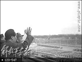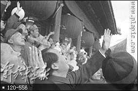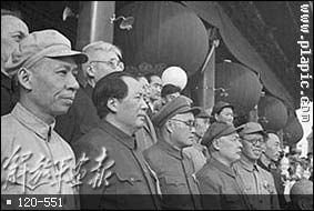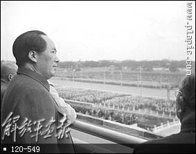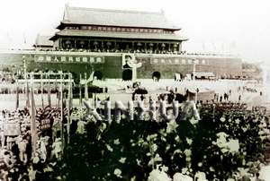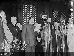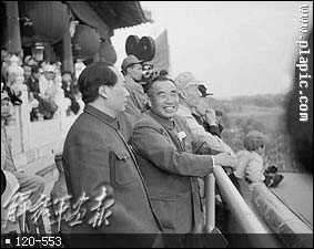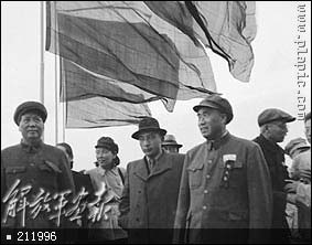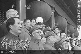 1949年10月1日,开国大典毛主席等党和国家领导人在天安门城楼上。(左起:毛主席、刘伯承、陈毅
