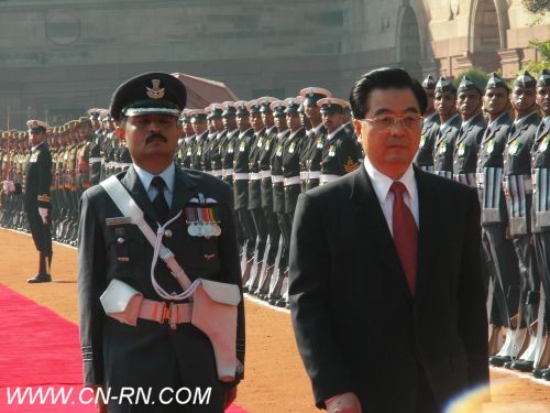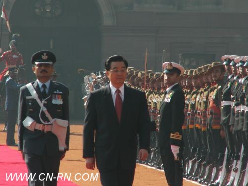 中国国家主席胡锦涛偕同夫人刘永清,出席印度总统卡拉姆在总统府前广场举行的欢迎仪式。