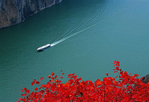 层层叠叠的红叶在陡峭的峡谷与碧绿河水的映衬下分外耀眼,白色的小艇在峡谷的浪花中驶出一串串白浪花,有一种无法言说的美丽。