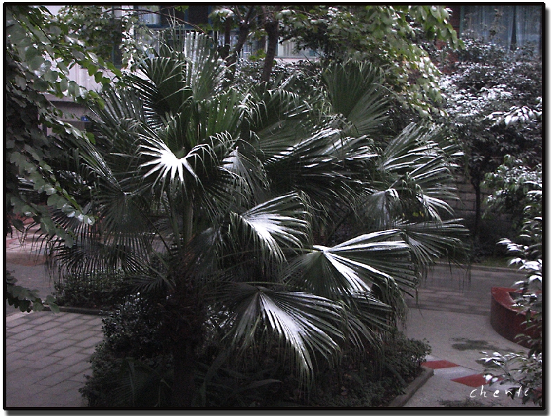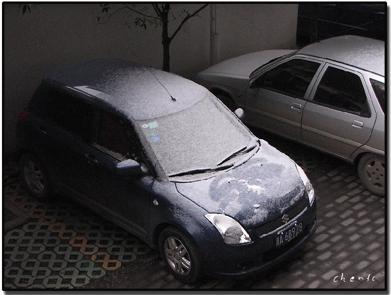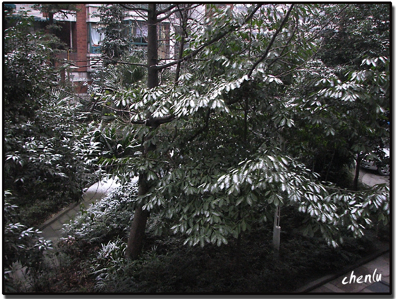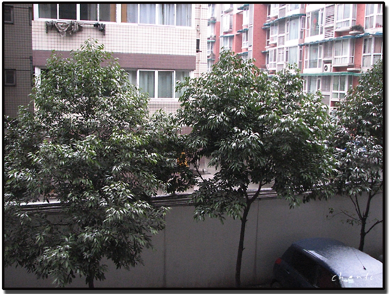 2008年1月28日清晨,刚推开窗,哇!庭院内的树上、车顶上都铺上了白雪,这可是成都好几年未见的咯,立马用相机拍下,现发上和大家分享。