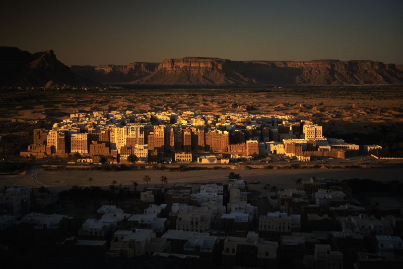 在阿拉伯半岛的沙漠中央拔地而起的一片高层建筑群给人一种海市蜃楼般不可思议的感觉。那简练的外观,雷同的造型不由让人联想到纽约的摩天大楼。这些用土坯为建材的建筑群高达30米,在中世纪来说的确堪称高层建筑。具考证这种高层建筑的由来是传统家族制度的产物。当时家族分家后一般不在外面新盖房屋另起炉灶,而是在原来的房屋顶上加层扩建,从而逐渐形成了这种高层建筑。每栋建筑为5层或8层结构,总共有500多座,居住有7000入左右。高楼的1、2层房间大多没有窗户(1层养家畜,2层作仓库),3层以上供人居住。屋顶和顶楼都涂有雪花石膏。这种涂白实际上对建筑物起到了保全作用。设想如果没有每年一度的涂白,300年前建造的房屋可能早已被侵蚀掉了。现存的建筑多为100年前或300年前建造的,最古老的还可追溯到10世纪。1982年被认定为世界遗产。
