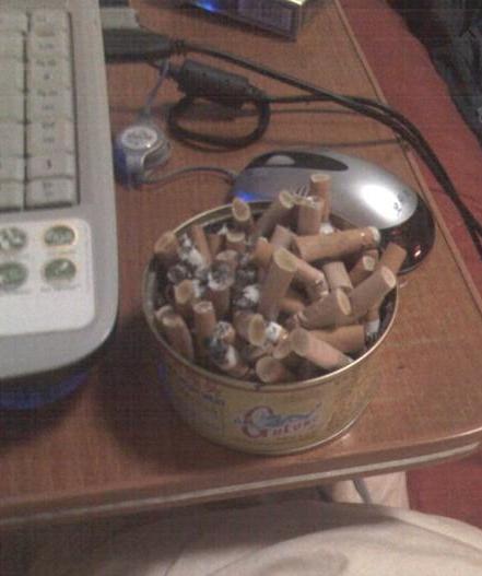 上次去超市买了一盒古龙午餐肉罐头,因为我原来那个烟缸实在太小了,我就用它烟缸。本人烟瘾挺重,基本上三天就能抽一罐头烟屁股