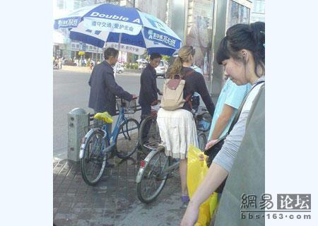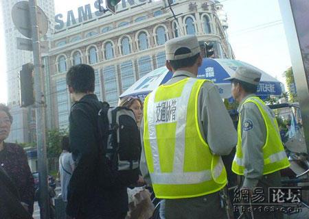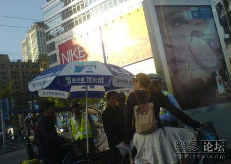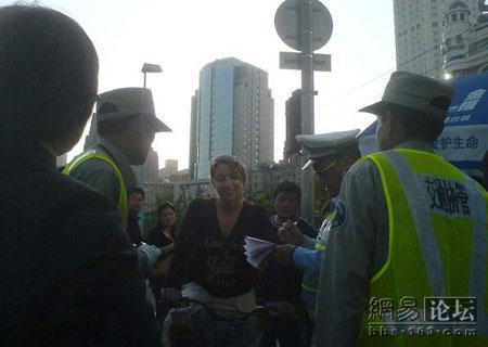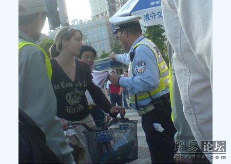 经过教育后老外显然变乖乖女了,推着车过去了,慢慢消失到路尽头了。上次听说上海的交警不敢托一辆兰博基尼的无牌照跑车,但是这次让我觉得还是很正义的!至少面对洋人一视同仁,罚款five yuan