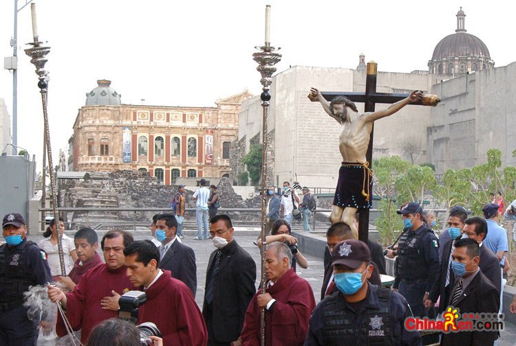 在墨西哥城的大教堂外,当地的宗教人士祈求“健康之神”赐给他们健康,结束猪流感。这项活动上次举行是在1691年墨西哥城爆发天花时。