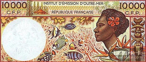 与贫困、饥饿、落后的非洲相比,法属波利尼西亚、新喀里多尼亚、瓦利斯和富图纳等,风景优美,物产丰富,居民过着无忧无虑的神仙生活。这种惬意的生活方式也带到了纸币上,于是形成了法属风格10000法郎的纸币:头戴花环的波利尼西亚少女,一头漂亮乌黑的秀发,夕阳的余辉洒在她的秀发上,留下了橙金色的光芒。人像处理的非常好,充满立体感。她身后的背景是傍晚的海边村寨,金色的天空、海水、民居,人们脑海中能够想象到的天堂景色也不过如此吧?