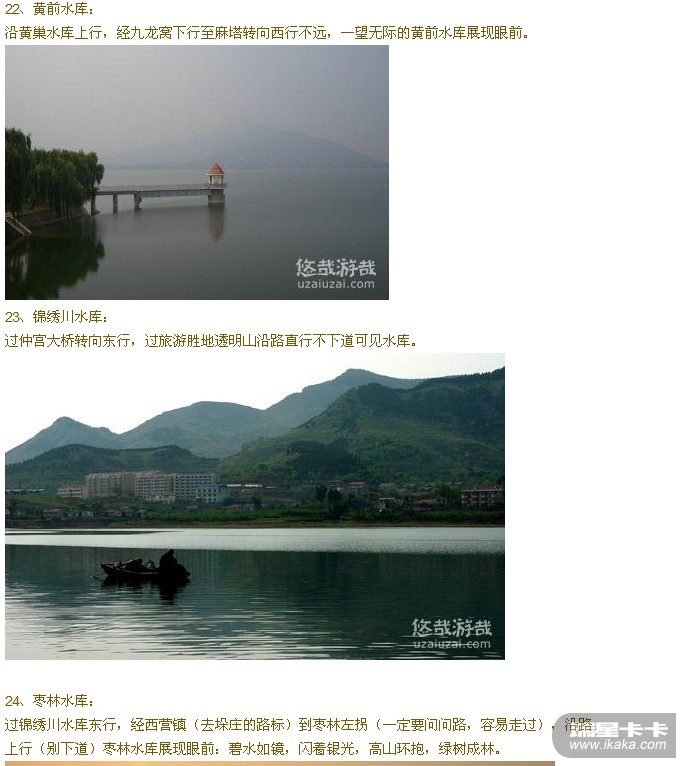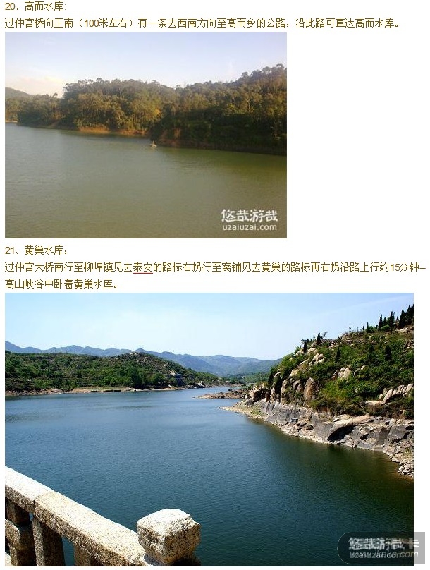38、张庄水库:距济南约40公里。路线: 王官庄过南外环走104国道, 过长清高速桥(不拐弯,向南走)约10分钟, 向西第二个路口向北到底再向西, 进村问村民。