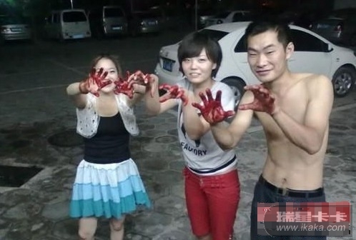 帖子中有7张照片,几个年轻人撕扯狗腿和皮毛,有些血腥。一张照片上,一名女孩轻松地笑着,背景是杀狗画面;最让网友看不下去的是,一张照片上,3个青年张开血淋淋的双手,做着鬼脸。