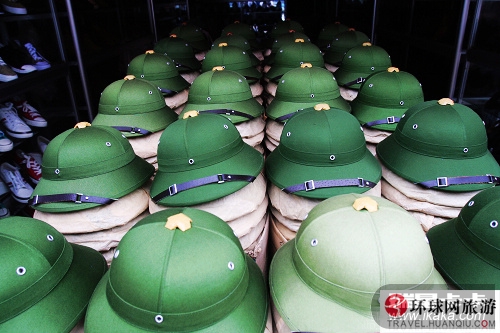 在越南有一大奇观,那就是百分之九十以上的男子汉都喜欢戴绿色的硬壳帽,货摊上也堆满了这种绿帽子,特别是那些摩托车手们戴着这劳什子串来串去,给人一种绿帽子满天飞的感觉。