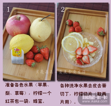 【材料】:各种水果、柠檬一个(用两片)、红茶包一个、蜂蜜适量。