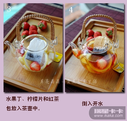 3. 水果丁、柠檬片和红茶包都放茶壶里。