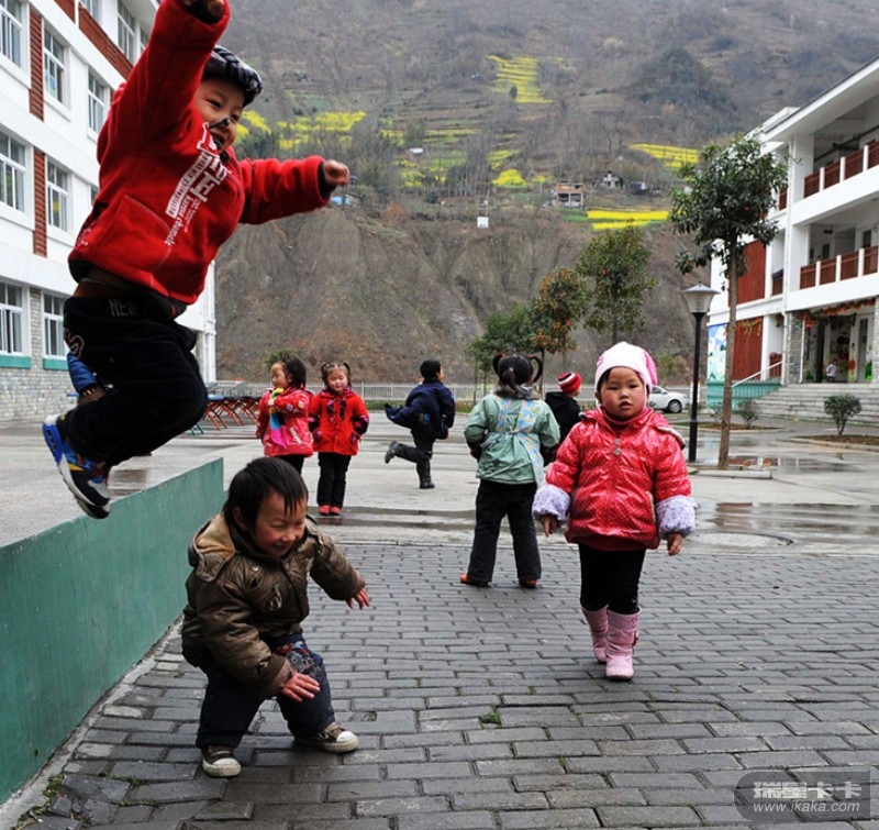 新北川陈家坝幼儿园的孩子在玩耍(3月21日摄)。
