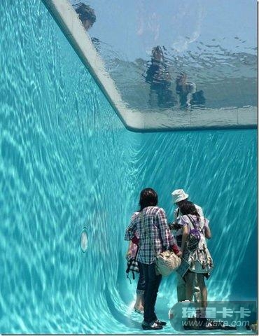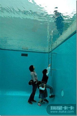 把人闷在水下,与外界隔离,这样看着,似乎有点KB,毕竟这不是我们所熟悉的方式。然而,来自阿根廷的 Erlich设计了这个看似KB的游泳池,目的是希望唤醒人们对地球淡水资源的重视。Leandro是当代杰出的装置艺术家,他喜欢使用普通的概念作为创作背景,加入一些装置,在规律中常隐藏着让人意想不到的细节,从而达到启发人们思考自身的效果。它用一个50厘米的水层隔离区将现实世界与水底世界分离,让无法体验两种经验的普通人类用另外的方式观看着这个看似正确却漏洞百出的世界存在。