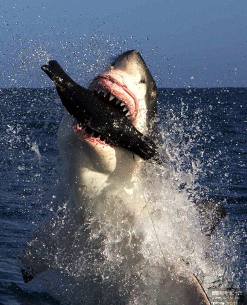 据英国《每日邮报》报道,这一幕看起来真是非常可怕,一条大白鲨猛然跃出水面,似乎进行着一场可怕的杀戮。但让人惊奇的是,在拍摄这一组照片的过程中并没有任何海豹受到伤害。原来这是鲨鱼专家迈克尔·拉兹坦(Michael Rutzen)耍的一个把戏:他用一头假海豹来吸引鲨鱼做出攻击动作,然后拍摄这些惊险的照片。图为大白鲨会从水下突然向猎物发起攻击,他的身体整个跃出水面。
