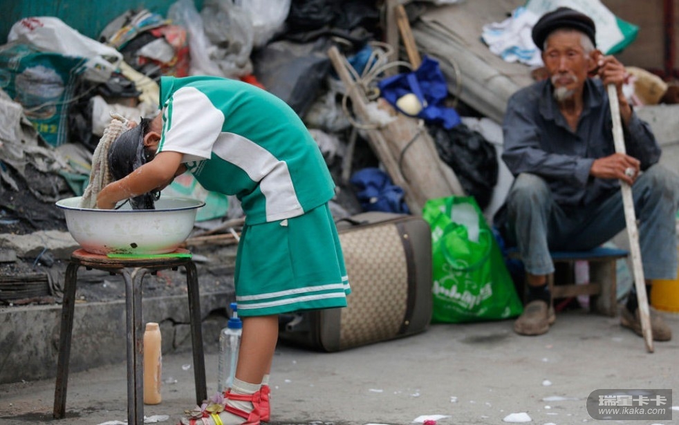 6月20日,北京外来民工居住区,小姑娘自己脸盆里洗头。