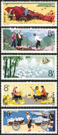邮电部于1979年8月10日发行了志号为T39的《人民公社五业兴旺》特种邮票1套5枚。分别是: (5-1)4分 机械收割(农业),(5-2)8分 植树造林(林业),(5-3)8分 水乡牧鸭(牧业),(5-4)8分 编织(副业),(5-5)10分 繁忙的渔港(渔业)。见图。