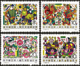 邮电部于1988年2月10日发行了志号为T125的《农村风情》特种邮票1套4枚。分别是:(4-1)8分 丰歌高奏 喜乐长鸣,(4-2)10分 各显神通 吉庆有余,(4-3)20分 知识闪光 龙腾凤飞,(4-4)30分 丰衣足食 安居乐业。见图。