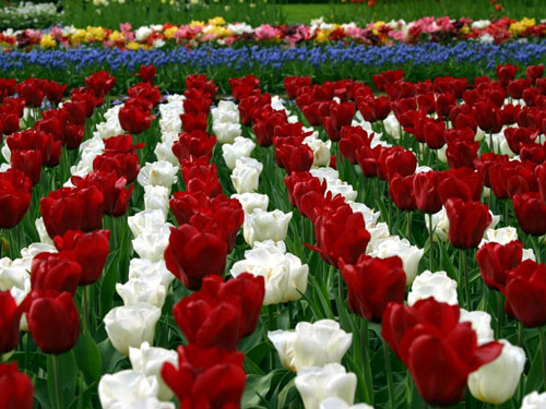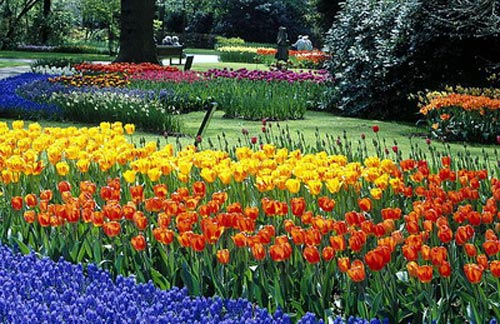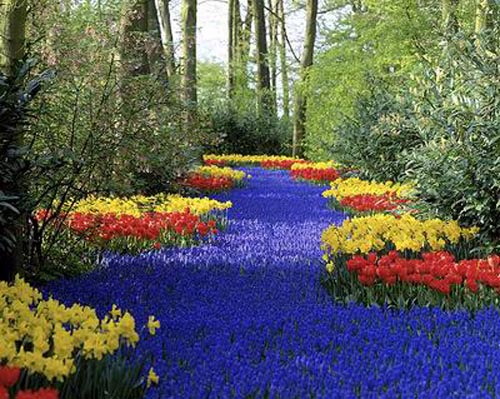 哥根霍夫公园占地28公顷,培育郁金香数百万株,500多个品种,有许多都是世间罕见,令人观之惊叹!走进公园,撞入眼帘的是片片花海,扑来阵阵花香,唯一的感觉就是震撼,美的震撼,震撼于郁金香的华丽绚烂!树林间、小路边、湖旁、草地,织锦般铺满了郁金香,天堂也不过如此了吧!