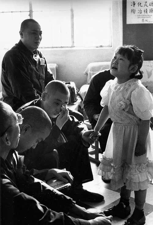 1993年5月17日,济南盲校的部分学生到山东第一监狱教育中队演出,一名身穿白裙的女学生来到犯人中间,小手在黄色硬纸凹凹的点状盲文上慢慢移动:“亲爱的叔叔,我叫王鸿斌,是个盲孩子…….。”突然她离开了讲稿站起身,“我生下来就不知道爸爸、妈妈的摸样,12年了我多么想看看他们,看看所有爱我、关心我的人啊!…….”小鸿斌哽咽出声说不下去了。在场的所有人的眼睛都湿润了。一位犯人强忍着泪水流下来,他拉着小鸿斌的手,轻轻给他擦泪。……可我的心不残,我要努力做生活的强者!接着小鸿斌深情地说:我知道你们一时糊涂犯了罪,心里难过,可叔叔千万别灰心呀!你们要努力把自己改造好呀!叔叔我给你们唱支歌:“这是心的呼唤,这是爱的奉献……”这歌声伴着眼泪,震撼着在场所有人的心。《身残与心残的撞击》我拍下了这动人的一瞬。儿童与壮汉,身残与心残,纯洁的童心与悔恨之人,在一瞬间撞击、交流、融化,化为世上最神圣的情感,这是善的启迪,人类良知的呼唤。这幅作品先后荣获自强、自立全国摄影大赛金牌奖,16届全国摄影艺术展银牌奖。