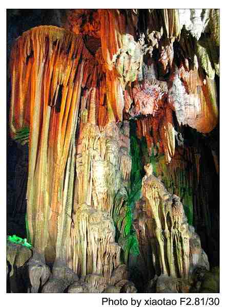 5月2日上午去芦笛岩,所谓的郊外,其实也并不是很远,几乎没有出租车到那边,但公交也就走了半个多小时。对于桂林的旅游景点门票,我实在是不敢恭维,这个岩洞门票价格居然要60元一张门票,这也是后来我打消去七星岩的念头的原因之一,并且觉得岩洞实在差异不大,不大喜欢这样人为强加的想象,虽然一些岩石也可以用“惟妙惟肖”来形容。洞中大量的石钟乳、石笋、石柱、石幔、石花, 是在岩洞形成以后, 含有碳酸盐类的地下水, 顺着岩石裂隙流出, 水份蒸发, 碳酸盐类沉淀结晶, 逐渐堆积而成。