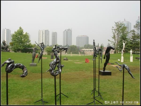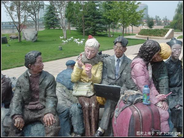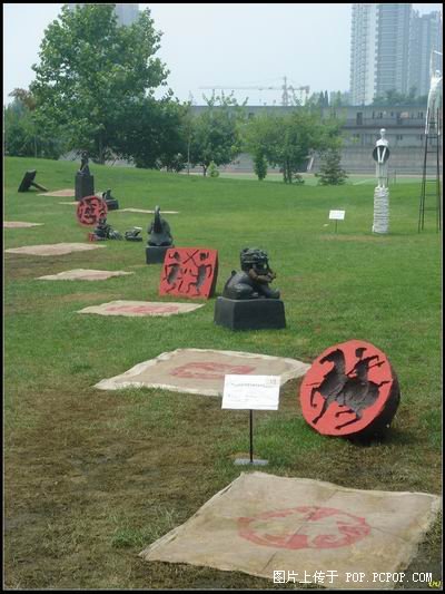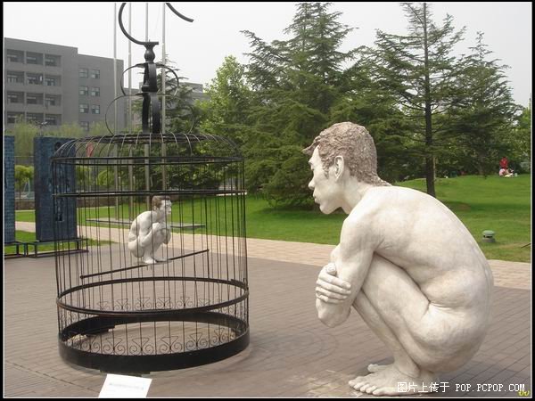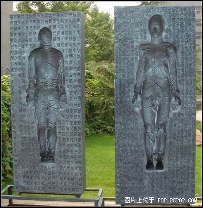 雕塑左右各为人体的正面与背面,分为两部分表现人生的来去,穿梭于充满文字文明的历史当中