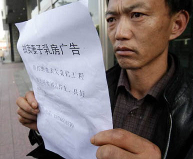 9月11日,在沈阳大街上两名中年男子公开叫卖妻子乳房,想就此吸引别人的注意,帮忙讨回打工钱。乳房又增添了新的“功用”——“丈夫以卖妻子乳房获同情为手段讨薪”!