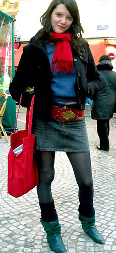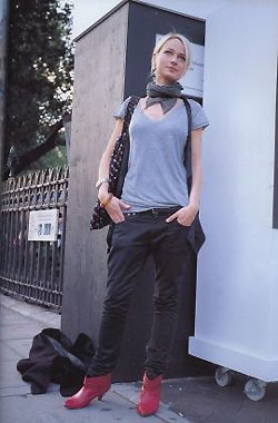 浅蓝色毛衫,红色的中靴皮鞋,打破规则的搭配方式,帮你提升气质。