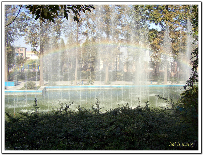 喷泉折映的,色彩不全.