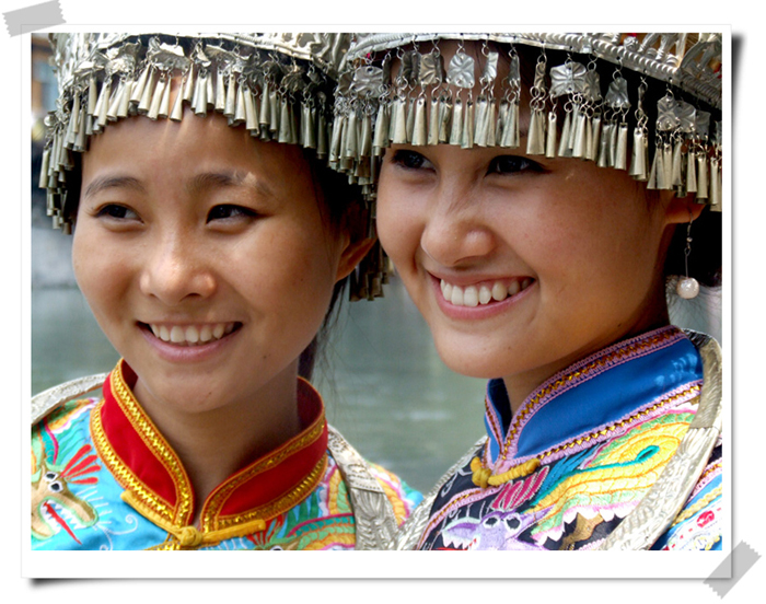 姊妹花原本是在合影的,看到我在一边偷拍,开心地和我打了一个招呼。另一个给她们拍照的女孩忙把相机递给我说:我不会拍照,你来帮个忙吧。我接过来一看,傻瓜胶片机?我对姊妹花说:用我的数码机好了,拍好了用电子邮件发给你们。看了显示出来的照片后,姊妹花开心得不得了,留下了姓名、电话和电子邮箱。闲谈中得知,姊妹花就是凤凰本地人,土家族(能歌善舞的民族),姐姐去年考上了广州星海音乐学院声乐系