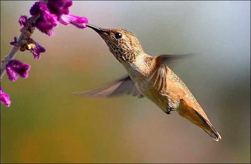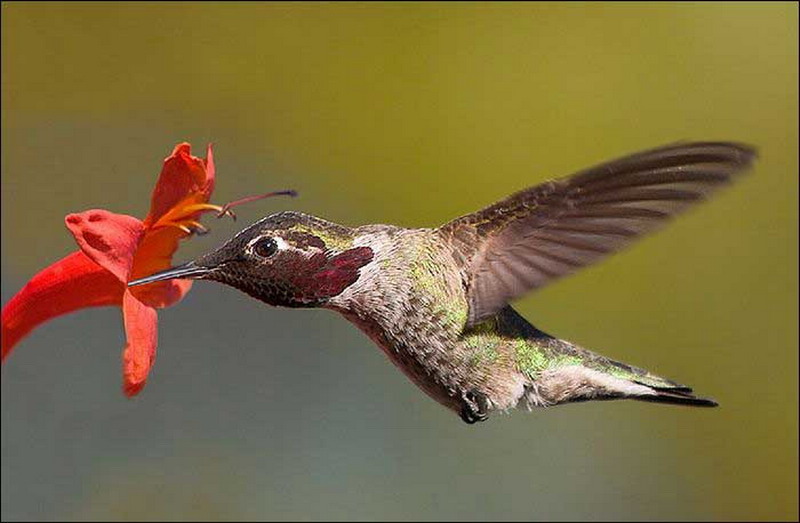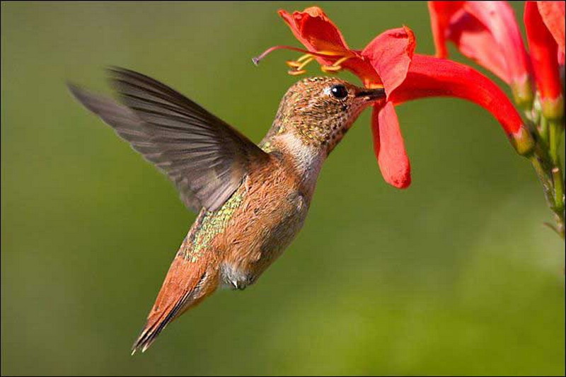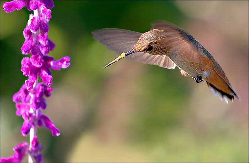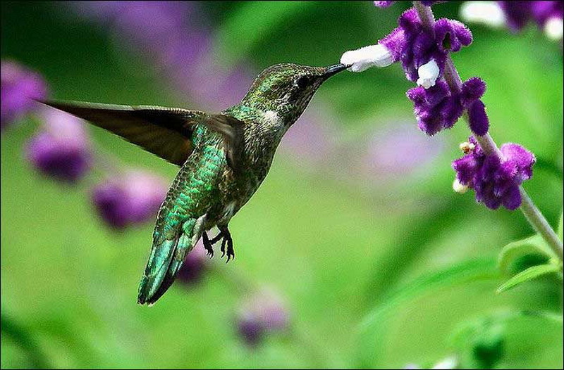 蜂鸟(hummingbird)是雨燕目蜂鸟科动物的统称。 蜂鸟身体很小,能够通过快速拍打翅膀(每秒15次到80次,取决于蜂鸟的大小)而悬停在空中。蜂鸟因拍打翅膀的嗡嗡声(humming)而得名。蜂鸟是唯一可以向后飞的鸟。 在所有动物当中,蜂鸟的体态最妍美,色彩最艳丽。精雕和玉琢的精品也无法同这大自然的瑰宝媲美,蜂鸟是世界上最小的鸟,“以其微未博得盛誉”.小蜂鸟是大自然的杰作:轻盈、迅疾、敏捷,优雅、华丽的羽毛--这小小的宠儿应有尽有。它身上闪烁着绿宝石、红宝石、黄宝石般的光芒,它从来不让地上的尘土玷污它的衣裳,而且它终日在空中飞翔,只不过偶尔擦过草地;它在花朵之间穿梭,以花蜜为食. 各种蜂鸟分布在新大陆最炎热的地区,主要在南美洲,它们数量众多,但仿佛只活跃在两条回归线之间,有些在夏天把活动范围扩展到温带,但也只作短暂的逗留; 在鸟类动物中,最小的蜂鸟体积比虻还小,体重只有2克,粗细不及熊蜂,卵重0.2克,和豌豆粒差不多。它的喙是一根细针,舌头是一根纤细的线;它的眼睛像两个闪光的黑点;它翅上的羽毛非常轻薄,好像是透明的;它的双足又短又小,不易为人察觉;它极少用足,停下来只是为了过夜;它飞翔起来持续不断,而且速度很快,发出嗡嗡的响声。它双翅的拍击非常迅捷,所以它在空中停留时不仅形状不变,而且看上去毫无动作,像直升飞机一样悬停, 只见它在一朵花前一动不动地停留片刻,然后箭一般朝另一朵花飞去.它用细长的舌头探进它们怀中,吮吸它们的花蜜,而且仿佛这是它舌头的唯一用途。 吸蜜蜂鸟 (Mellisuga helenae) 重1.8克,是世界上最小的鸟。还有一种典型的北美蜂鸟, 红喉北蜂鸟 (Archilochus colubris)重量约3克左右,身长7.6公分。蜂鸟中体型最大的是巨蜂鸟(Patagona gigas),其体重也只有20g。 蜂鸟的飞行本领高超,也被人们称为"神鸟"、"彗星"、"森林女神"和"花冠"。