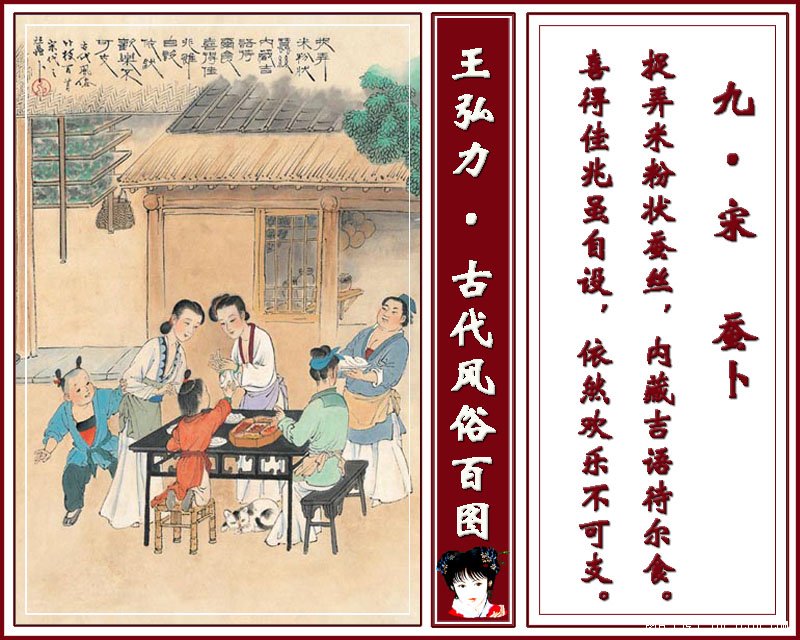九 宋 蚕卜 捉弄米粉状蚕丝,内藏吉语待尔食。喜得佳兆虽自设,依然欢乐不可支。