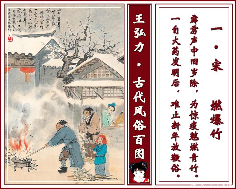 一 宋 燃爆竹 霹雳声中旧岁除,为惊疫魃燃青竹。一自火药发明后,难止新年放鞭俗