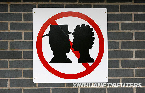 2月16日在英国沃灵顿的火车站拍摄的照片显示的是一个禁止接吻的标志。