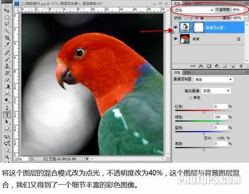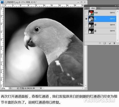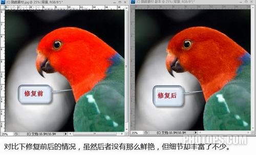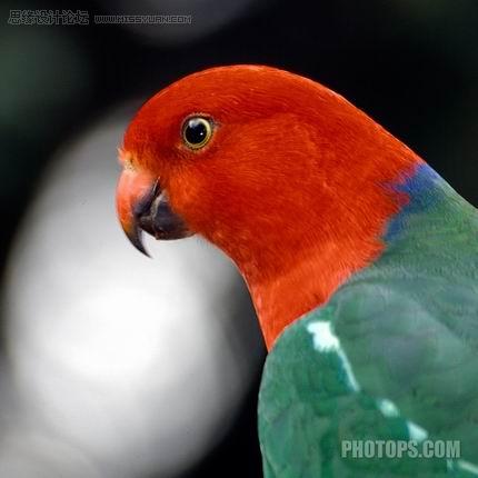 下面的这张鹦鹉图,色彩虽然艳丽,但由于红色过于饱和,却丢掉了许多细节。通过降低红色饱和度,就能得到一张比原来细节丰富的图。可见,色彩要用的恰当,不是越浓越好。