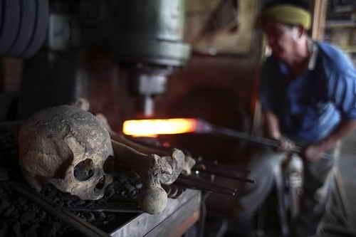 古代传说中才有“人骨炼剑”出现在了现代的台湾。台湾铸剑师郭常喜使用人骨炼剑已近40年。郭常喜正在铸剑,炉边摆放着炼剑用的人类头骨。郭常喜以科学角度解释说,古代炼剑利用天然铁矿,矿中含有铜等其他金属,因受限炼制技术无法熔合,投入人骨后,骨中磷、钙等成分可吸收铁水中杂质,使铁质更为精纯,正如现代炼钢厂在铁砂中加石灰,吸收杂质。谈起人骨炼剑术,郭常喜说,是他祖父传下来的,他从20岁开始试验人骨和一般炼剑的差别,发现加入人骨剑的钢质确实较好。因此他深信,人骨炼剑确有其事。郭常喜展示用人骨炼成的宝剑。郭常喜强调,人骨炼剑都是受寺庙委托,才会以人骨炼铸。除了以人骨炼剑,他还使用棺材板雕制剑鞘,还用整块棺材盖放在店外当作招牌。郭常喜正在用人骨淬炼宝剑。走进郭常喜兴达港的刀铺,细心者会发现,熔炉下方供奉着几支人骨,终年香烟不断,他甚至还可随时搬出一整瓮人骨。